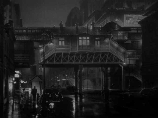 The other indelible sequence also comes direct from the novel. Carol puts psychological pressure on a bartender (Andrew Tombes), whom she suspects is hiding information about the Phantom Lady, by spending night after night staring at him from the end of the bar. She then stalks him onto the platform of an elevated train, where the solitary eeriness of the situation almost drives the bartender to push her in front of the oncoming train. The staging, lighting, use of sound effects, and the matte paintings of the station and city beyond create film noir perfection. As a Woolrich fan, it’s breathtaking to see his literary universe of suspense, isolation, desperation, and the oppressive nature of the city caught on screen in such a short space. There are better Woolrich movie adaptations ahead, but few single stretches of film capture his style and themes in such concentration. It’s hard to imagine a better blueprint for all of film noir.