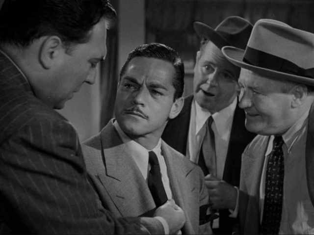 Bernard C. Schoenfeld’s script follows Woolrich’s plot semi-faithfully, taking liberties in the second half. More important is its success at capturing Woolrich’s tone of helplessness and bleak fate. Siodmak’s visual style is impressive, and he knows how to make the city into a sinister trap. The scene where the police confront Scott when he comes back to his apartment to find his wife dead is filled with subtle tricks to give the sense of a man inside a closing snare. Once the murdered woman’s body is carried from the room on a stretcher (something we don’t see, only the reactions of the characters to it), three police detectives form a tight circle around Scott and push in with their insinuations to make him break.